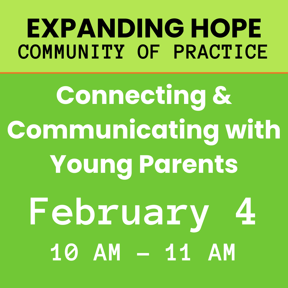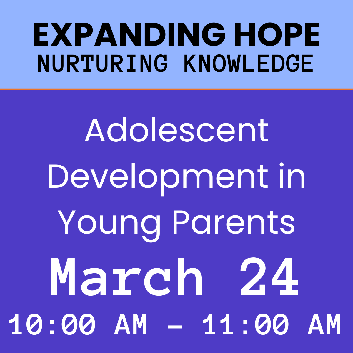 Expanding Hope also hosts a regular Break to Educate session. This series will feature regular special guests who will come share their knowledge and expertise on topics related to supporting teen parents. We are so excited to offer this incredible online learning opportunity so we can all improve our services for youth and young families.