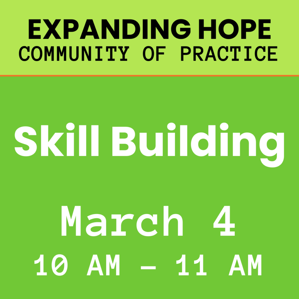 We are pleased to offer a dedicated space for professionals to bring any questions or challenges they may face when working with young parents. Through this service you can receive virtual one-on-one support from Expanding Hope staff for specific concerns and best practices for supporting pregnant and parenting young families.